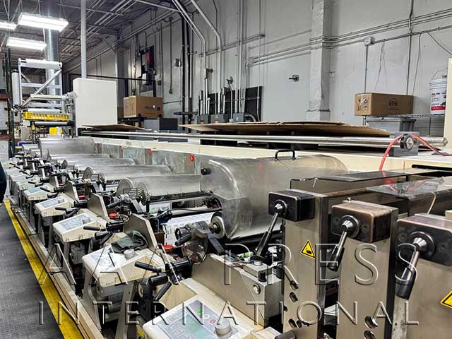 2007, Width: 26", 1/8" Helical Gearing, 8 Chill Rolls, Automatic Throws / Constant Turn Anilox Rolls, 8 Dr. Blade Assemblies, 1 Product Rewind, 49" Rewind Diameter, 1 Unwind, 49" Unwind Diameter, 1 Electronic Edge Guide, 8 IST Single-Lamp UV Units, Web Cleaning System, Cold Foil Stamping, Approx. 29 Ceramic Anilox Rolls, Approx. 248 Plate Cylinders. 26" Shrink Sleeve & Unsupported Film Press. Includes unwind & rewind roll lifts, Telstar cold foiling unit, Chambered dr. blade assemblies w/ink pumps for high speed operation.