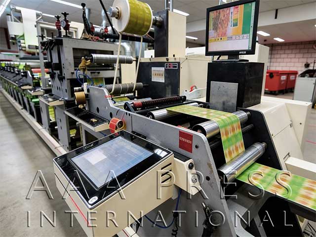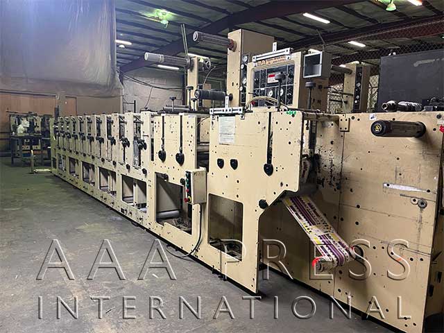2015, Width: 14.5", 1/8" Gearing, 8 Chill Rolls, Automatic Throws / Constant Turn Anilox Rolls, 8 Dr. Blade Assemblies, 1 Product Rewind, 40" Rewind Diameter, 1 Waste Rewind, 1 Unwind, 40" Unwind Diameter, 2 Die Stations, 2 Removable Base Rolls, 1 Sheeting Station, 1 Laminator, 1 Electronic Edge Guide, 1 Turn-bar, 1 Stacker, 8 GEW EDX Single-Lamp UV Units, 1 Video Web Inspection System, Web Cleaning System, Cold Foil Stamping, Anilox Rolls, Plate Cylinders. Fully Servo Controlled Multi-substrate Press. Includes drop-in shaft-less bearer style plate roll technology, accessory rail system with mounted turnbar & lam unwind-rewind & layon roller, (1) set of Hydrajack die pressure gauge assemblies, two video web inspection monitors, water chilling system and a significant inventory or plate cylinders, anilox rolls and magnetic die cylinders. Excelent, "Like-New" condition!