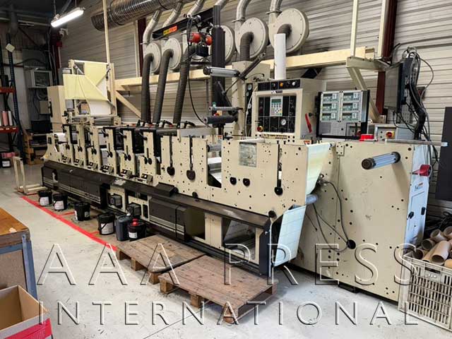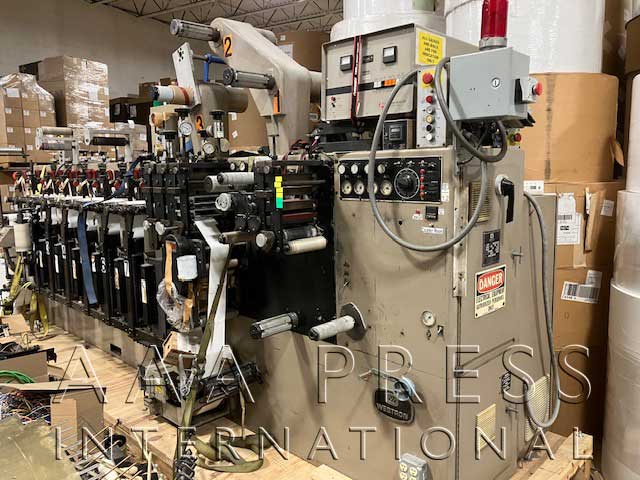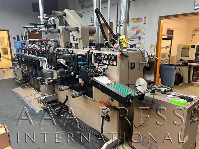 Width: 7.5", mhours: 14242, 1/8" Gearing, Automatic Throws / Constant Turn Anilox Rolls, 6 Quick Change Anilox Assemblies, Dr. Blade Assembly, 6 Webtron 4-Way Heads, 6 Webtron OBS, 2 Product Rewinds, 2 Waste Rewinds, 1 Unwind, 3 Die Stations, 4 Removable Base Rolls, 1 Sheeting Station, Underscoring Unit, 1 Laminator, 1 Hydraulic Edge Guide, 1 Turn-bar, 1 Stacker, 1 Single-Lamp UV Unit, 1 Strobe Light, Web Cleaning System, Cold Foil Stamping, Approx. 23 Ceramic Anilox Rolls, Approx. 275 Plate Cylinders. Includes Webtron hysteresis infeed tension control, Julie Quiet Machine II single sided non-contact web cleaner, advanced Graphics overhead plow-folder assy., WT-1 Plate cutter, Webtron 750 plate mounter, Sonic Solutions ultrasonic anilox cleaning system, & over 1,000 solid rotary dies. Low Hours - Great Condition!