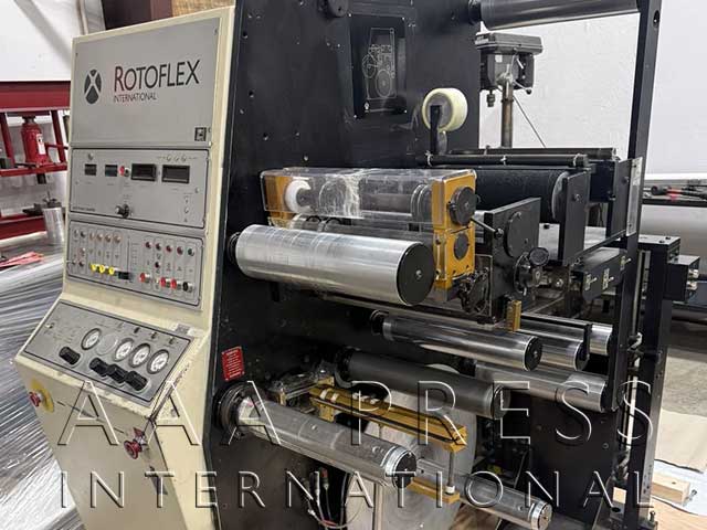 Width: 13", 1/8" Gearing, Automatic Throws / Constant Turn Anilox Rolls, 2 Product Rewinds, 30" Rewind Diameter, 1 Waste Rewind, 1 Unwind, 40" Unwind Diameter, 3 Die Stations, 3 Removable Base Rolls, 1 Sheeting Station, 1 Laminator, 1 Electronic Edge Guide, 1 Turn-bar, 1 400-WPI Single-Lamp UV Unit, 1 Video Web Inspection System. Includes integrated unwind roll lifter, infeed pacing system & Duplex product rewinds.